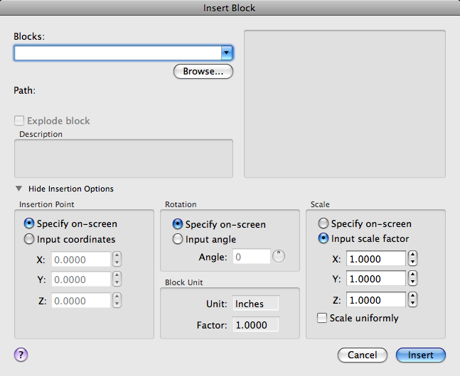 Expands or collapses the Insertion Options section to allow you to specify the insertion point, rotation and scale for the block reference being created.