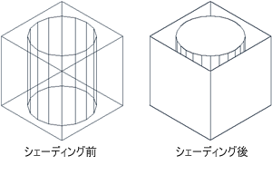 SHADE[シェーディング]コマンドは、シェーディングされるオブジェクトの色を使用します。シェーディングによる計算は、ユーザの眼の真後ろからくる 1 つの光源に基づいて計算されます。シェーディングを行った後に図面を変更した場合、その変更をシェーディングされたオブジェクトに反映するには、もう一度 SHADE コマンドを使用します。