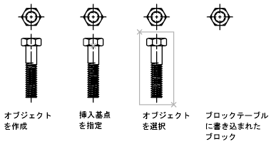 次の図は、図面内でブロック定義を作成する一般的な順序を示しています。