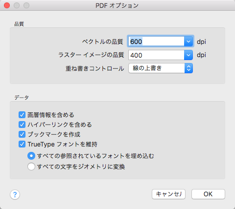 - PDF ファイルに TrueType フォントを埋め込み、PDF ビューアで使用可能にする必要をなくします。このオプションをオンにしないと、PDF ビューアでは代替フォントが使用されます。