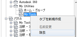注意: リボン タブからのリボン パネルの除去操作を元に戻す方法はありません。間違ったリボン パネルを除去してしまった場合は、[キャンセル]をクリックして[ユーザ インタフェースをカスタマイズ] (CUI)エディタを閉じることによって、変更が保存されないようにしてください。ただし、このようにすると、意図したものも含めすべての変更が元に戻されてしまいます。