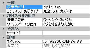 4. ツリー表示で新しく作成したリボン タブを選択し、[プロパティ]ペインで次のように変更します。