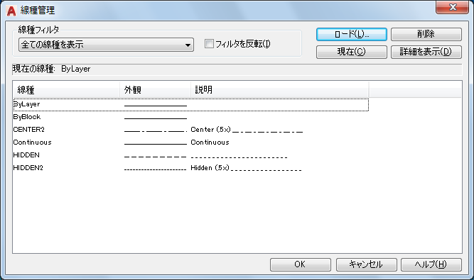 ロードされている線種が表示されます。線種の名前を変更するには、線種の名前を選択し、もう一度クリックし、新しい名前を入力します。ByLayer、ByBlock、Continuous、および外部参照に従属する線種の名前は変更できません。