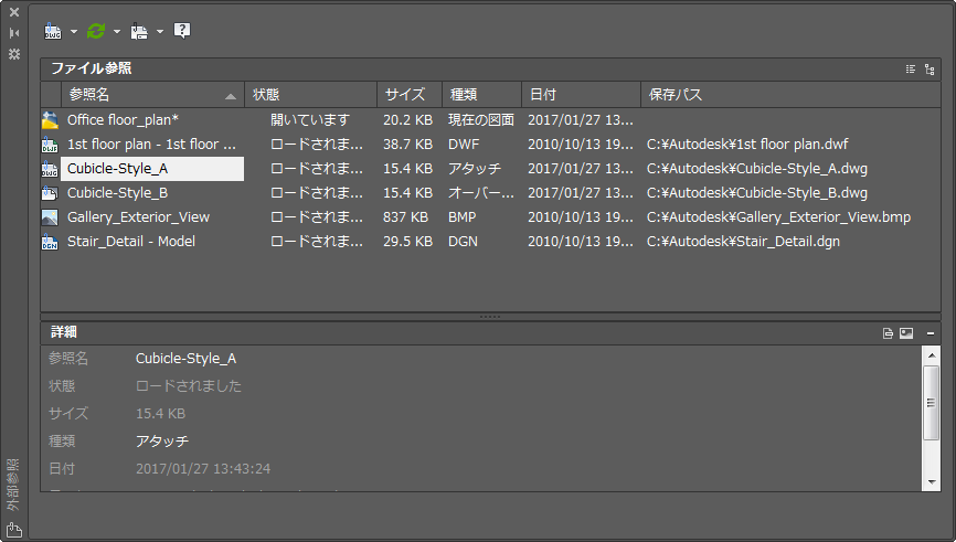- 現在の図面内の参照一覧(ステータス、サイズ、作成日などの情報を含む)が表示されます。