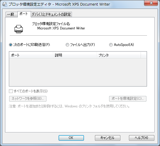 使用可能なローカル ポートとネットワーク ポートのリスト、および各ポートの説明が表示されます。ネットワーク ポートの場合は、ネットワーク プリンタの名前も表示されます。