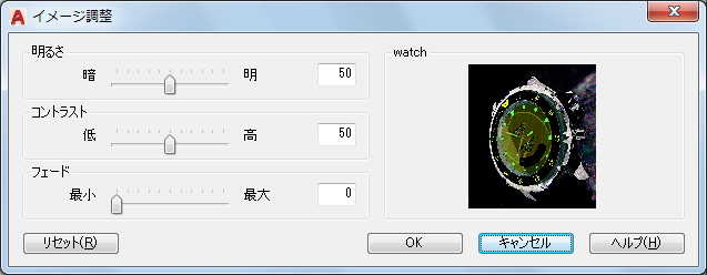 明るさ、コントラスト、フェードの各値が、既定(それぞれ 50、50、0)にリセットされます。