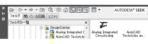 [フォルダ]、[開いている図面]、[ヒストリ]タブ、および右上の[Autodesk Seek]ボタンには、コンテンツにアクセスするいくつかの方法が用意されています。