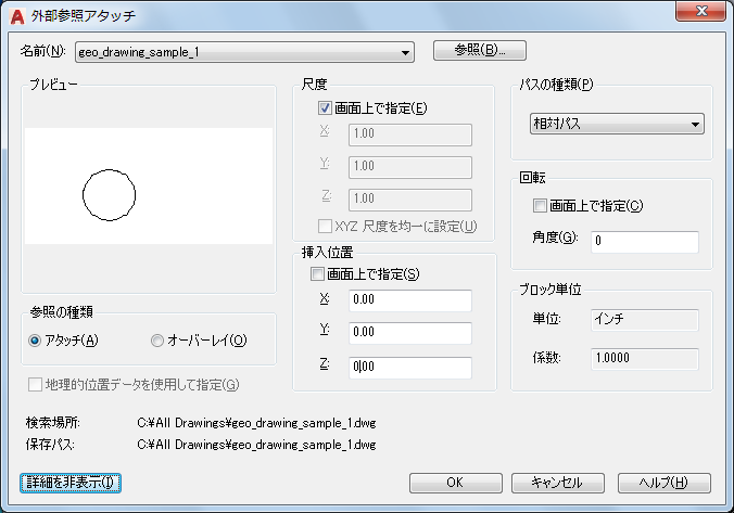 外部参照ファイルをアタッチしたとき図面とともに保存されるパスが表示されます。パスは、[パスの種類]の設定によって異なります。
