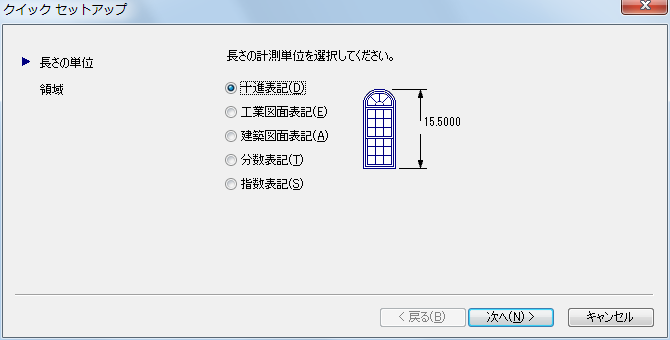 長さの単位、角度の単位、角度の基準、角度の方向は、後で UNITS[単位管理]コマンドを使用して変更できます。また、領域は後で LIMITS[図面範囲設定]コマンドを使用して変更できます。