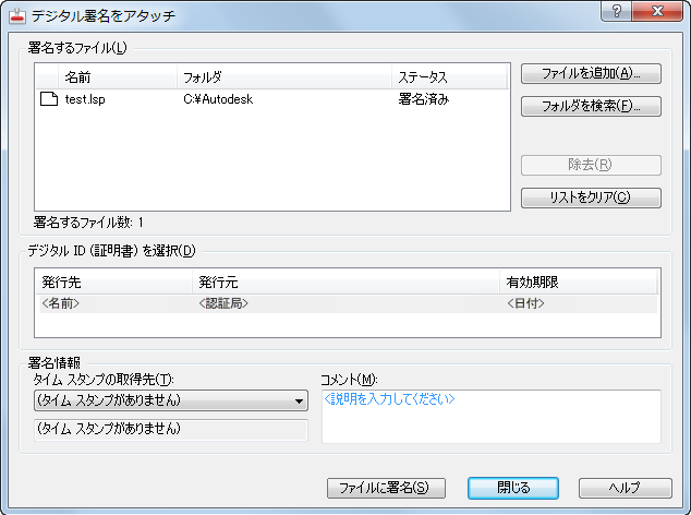 このダイアログ ボックスにリストされているすべてのファイルにデジタル署名をアタッチします。