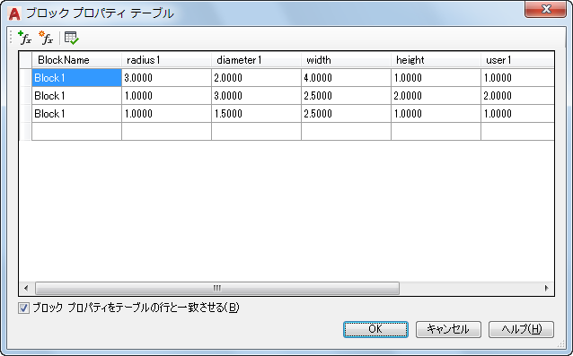 [ブロック プロパティ テーブル]ダイアログ ボックスでは、列見出しがパラメータで、行でプロパティ セットの値を定義します。選択したブロック参照を定義した値に設定することができます。ブロック定義テーブルごとに、テーブルは 1 つです。