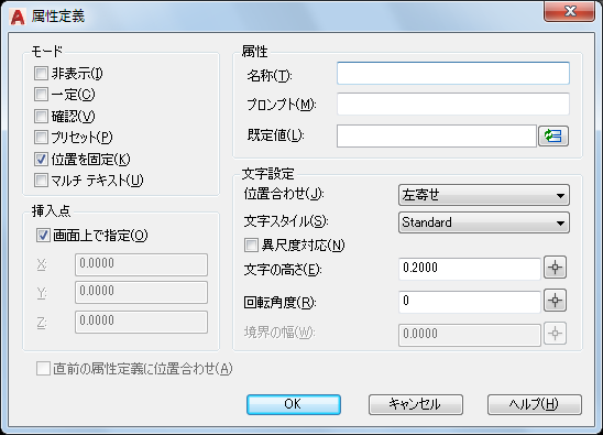 属性文字の位置合わせ、文字スタイル、高さ、回転角度を設定します。