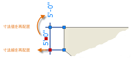 この例では、寸法を選択してグリップを表示します。次に、寸法値のグリップをクリックして新しい位置にドラッグするか、寸法線の端点のグリップの 1 つをクリックして寸法線をドラッグします。