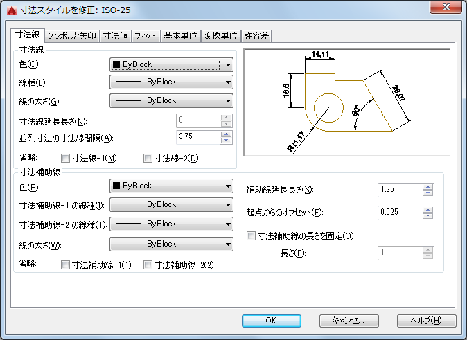 既定の寸法スタイルは、Standard (フィート/インチ)または ISO-25 (メートル)という名前です。このスタイルは、別のスタイルを現在の寸法スタイルに設定しない限り、すべての寸法に割り当てられます。