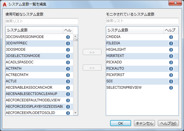 注: 読み込み専用のシステム変数は、一覧から除外されます。