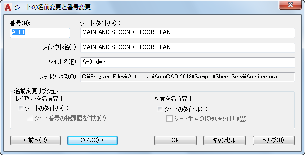 このチェック ボックスをオンにすると、レイアウト名が、シート タイトルの先頭にシート番号を付加した形式の新しい名前に変更されます。