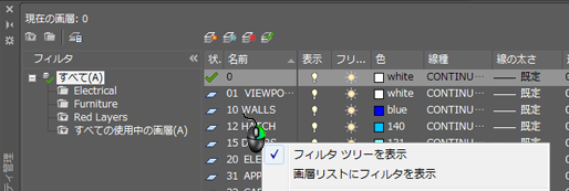 画層リスト一番上にフィルタを表示します。画層リストに画層のみを表示するには、このオプションをオフにします。