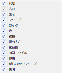 すべての列を名前別に一覧表示します。チェック マークが付いている列は、表示に含まれています。列名をクリックすると、列の表示と非表示が切り替わります。[VP でフリーズ]、[VP の色]、[VP の線種]、[VP の線の太さ]、[VP の印刷スタイル]は、レイアウト ビューポートがアクティブな場合に限り有効です。