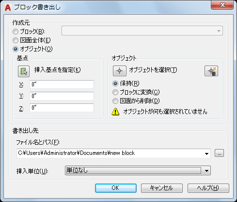 ブロック、オブジェクトを選択し、これらをファイルとして保存し、挿入点を指定します。