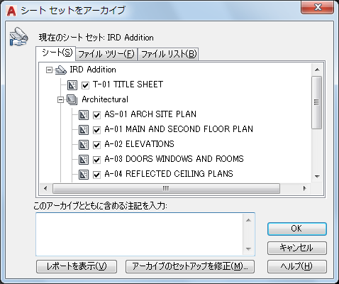 アーカイブ パッケージに含めるシートが、シート順およびサブセットの編成に従って表示されます。シート セットは[シート セット マネージャ]で開かれていなければなりません。[アーカイブ]は、最上位のシート セット ノードを右クリックして表示されるショートカット メニューから選択できます。また、コマンド プロンプトに対して、ARCHIVE と入力することもできます。