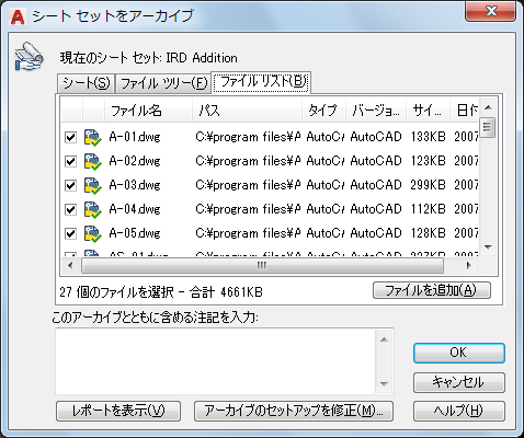 アーカイブ パッケージに含まれるファイルが表形式で一覧表示されます。既定では、現在の図面に関連付けらていれるすべてのファイル(関連する外部参照、印刷スタイル、フォントなど)が一覧表示されます。アーカイブ パッケージに他のファイルを追加したり、既存のファイルを除外することができます。URL によって参照される関連ファイルは、アーカイブ パッケージには含まれません。