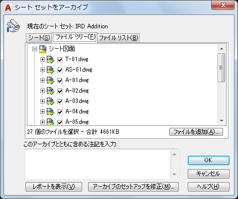 アーカイブ パッケージに含まれるファイルが階層構造のツリー形式で一覧表示されます。既定では、現在の図面に関連付けらていれるすべてのファイル(関連する外部参照、印刷スタイル、フォントなど)が一覧表示されます。アーカイブ パッケージに他のファイルを追加したり、既存のファイルを除外することができます。URL によって参照される関連ファイルは、アーカイブ パッケージには含まれません。