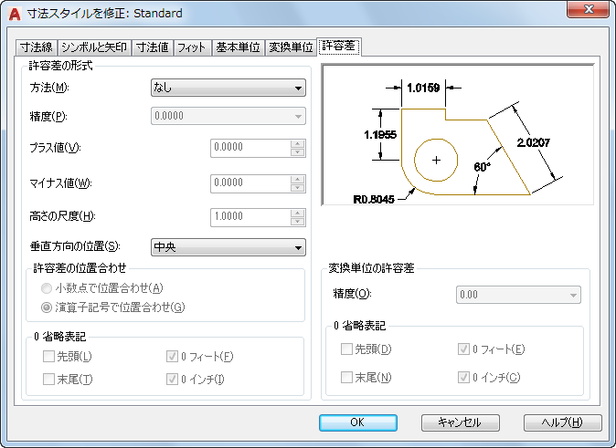 数値の先頭と末尾の 0(ゼロ)、およびフィート-インチ表記での 0(ゼロ)の省略をコントロールします。(システム変数 DIMTZIN[寸法許容差 0 省略])