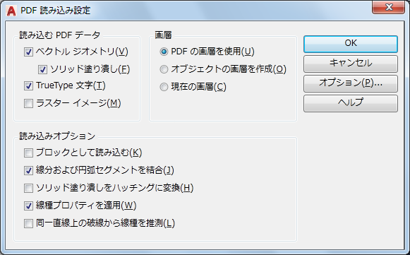 指定した PDF ファイルからジオメトリ、塗り潰し、ラスター イメージ、TrueType 文字オブジェクトを読み込むためのオプションを設定します。