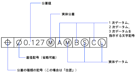 公差記入枠は、2 つ以上の構成要素で構成されます。1 番目の公差記入枠には、公差の種類を表す記号が表示されます。この記号は、位置、外形線、形状、方向、振れなど、公差の適用対象となるジオメトリ特性を表します。たとえば、形状公差は、真直度、平面度、真円度、円筒度をコントロールします。外形線は線や面をコントロールします。次の図では、ジオメトリ特性として位置が指定されています。