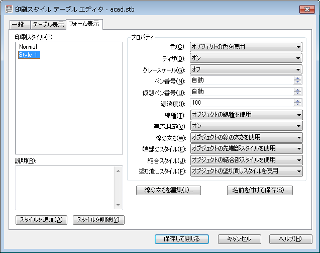 印刷スタイルは表形式で表示されます(リストの一番上にすべての印刷スタイルが左から右へ表示され、その下にそれぞれのプロパティが表示されます)。一般的に、印刷スタイルの数が少ない場合は、[テーブル表示]タブを使用した方が便利です。印刷スタイルの数が多い場合は、[フォーム表示]タブを使用した方が便利です。[フォーム表示]タブでは、左側に印刷スタイル名のリストが表示され、選択した印刷スタイルのプロパティが右側に表示されます。名前の付いた印刷スタイル テーブルの最初の印刷スタイルは Normal(標準)です。これは、オブジェクトの既定のプロパティを表しています(ユーザ定義の印刷スタイルは適用されません)。 NORMAL(標準)スタイルは、変更も削除もできません。