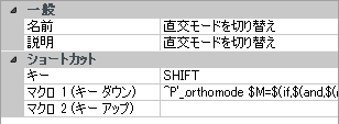 - [マクロ 2 (キー アップ)]ボックスに、一時優先キーを放したときに実行されるマクロを入力します。値を定義しない場合、キー アップすると、アプリケーションと図面の設定は前の状態(一時優先が実行される前の状態)に復元されます。