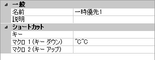 - [マクロ 2 (キー アップ)]ボックスに、一時優先キーを放したときに実行されるマクロを入力します。値を定義しない場合、キー アップすると、アプリケーションは前の状態(一時優先が実行される前の状態)に復元されます。