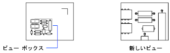 矩形のビュー ボックスを使用して、画面移動およびズームします。ビュー ボックスはビューを表現するもので、サイズを変更したり、図面上で移動することができます。ビュー ボックスを移動したりサイズを変更すると、そのビュー ボックス内のビューがビューポートにちょうど収まるように、画面移動またはズームが行われます。パース投影では使用できません。