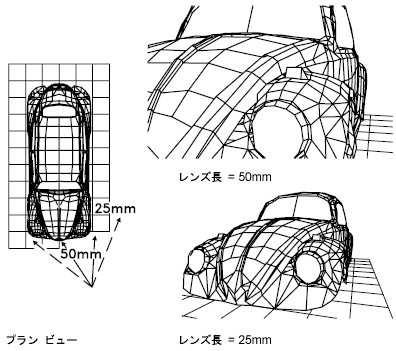 パース ビュー モードがオンの場合は、このオプションを使用してカメラ レンズの長さを調整します。これにより視野が変更され、特定のカメラと目標間距離での図面の見た目の大きさが増減します。既定のレンズ長は 50 mm で、これは 35 mm カメラと 50 mm レンズを使用したときの見た目の大きさをシミュレートします。レンズ長を大きくすると、望遠レンズに交換したときと同じような効果が得られます。レンズ長を小さくすると、広角レンズと交換したときと同じように視野が広くなります。