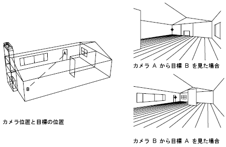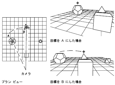 目標に対するカメラの位置を設定しやすくするために、目標点からクロスヘア カーソルまでラバーバンド線が表示されます。図は、カメラ点と目標点を交換したときのビューの変化を示しています。レンズと距離の設定値はどちらの場合も同じです。