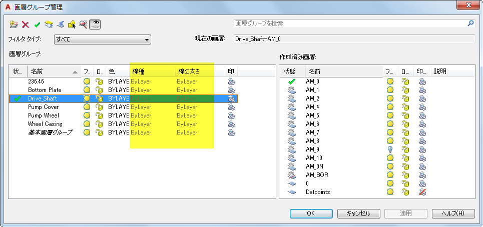 [画層グループ管理]では、画層グループの色の指定方法と同様の方法で、画層グループの線種と線の太さを指定できるようになりました。