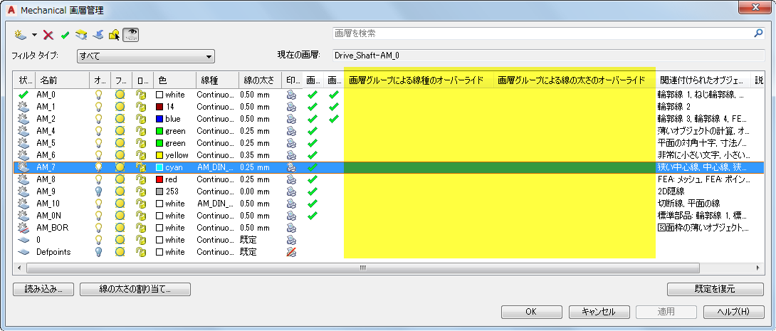 [Mechanical 画層管理]では、画層の線種と線の太さを、画層グループの線種と線の太さでオーバーライドできるようになりました。