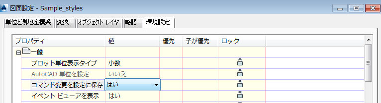 - [環境設定]タブをクリックし、[一般]プロパティを展開します。[コマンド変更を設定に保存]プロパティを[はい]に設定します。