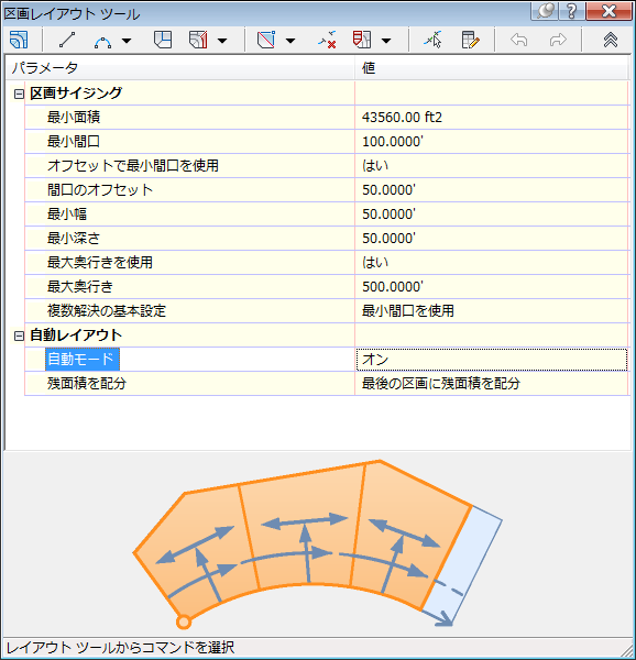 [区画レイアウト ツール]を使用して、既存の区画を自動的または半自動的に分割できます。自動モードでは、区画レイアウト ツールを使用して、使用可能な面積を占有する複数の新規区画を自動的に配置、プレビューすることができます。[自動モード]をオフにすると、レイアウト ツールによって新規の提示区画が 1 度に配置されます。