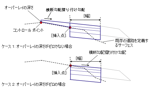 アタッチメント ポイントは、[オーバーレイの深さ]がゼロ以外の場合はオーバーレイ層上面の内端、[オーバーレイの深さ]がゼロの場合は拡幅車線の表層の内端にあります。