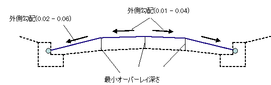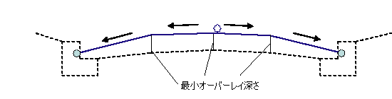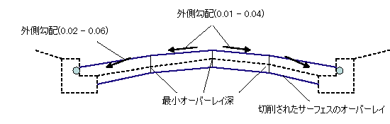 オーバーレイ リンクの勾配が大きすぎる場合、中心線で最大ブレークオーバーを超える場合、または最小クラウン偏差を満たしていない場合は、一部またはすべてのリンクがそれぞれの最大勾配まで平坦化されます。また、四分点と中心線におけるオーバーレイ最小深さを維持するため、サーフェスの切削が挿入されます。