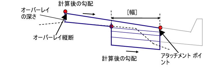 アタッチメント ポイントが、拡幅の外端のオフセットと標高を決定します。拡幅の内端の位置およびオーバーレイの内端の位置は、幅と勾配の指定値を基に決定されます。線形を使用すると、幅の指定値(数値)を変更することができます。オーバーレイ縦断が指定されている場合、勾配は、オーバーレイの内端の縦断標高とアタッチメント ポイントとの間で計算されます。