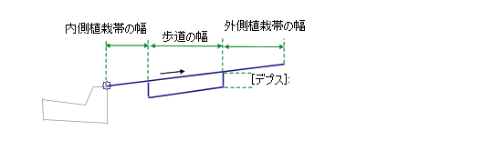 内側の植栽帯、歩道、および外側の植栽帯リンクが、指定した勾配でアタッチメント ポイントから外側に向かって挿入されます。植栽帯は、幅にゼロを指定することで、省略することができます。