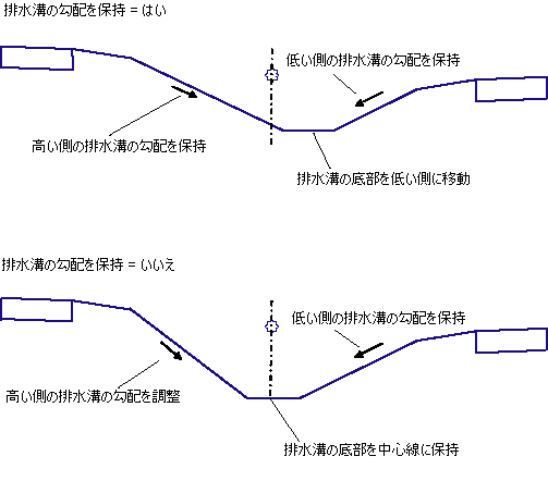 排水溝勾配の上端標高が左右で異なる場合、排水溝の法面を維持して排水溝の位置を移動するか、または排水溝の位置を常に中央に維持して上端標高が高い側の法面を調整するかを選択します。 |