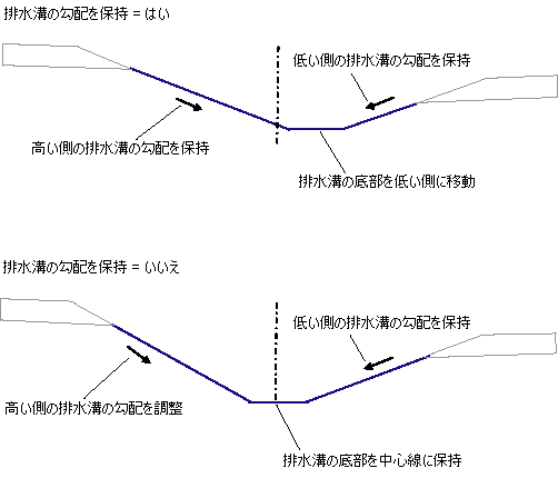 排水溝勾配の上端標高が左右で異なる場合、排水溝の法面を維持して排水溝の位置を移動するか、または排水溝の位置を常に中央に維持して上端標高が高い側の法面を調整するかを選択します。 |