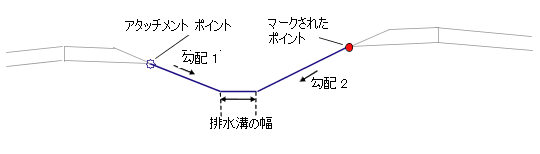 アタッチメント ポイントとマークされたポイントの位置を決定します。マークされたポイントは、アタッチメント ポイントの左右どちら側に位置してもかまいません。アタッチメント ポイントを起点とするリンクは勾配 1 の指定に、マークされたポイントを起点とするリンクは勾配 2 の指定に従い、それぞれのリンクが交差するまで内側に延長されます。排水溝の幅を指定すると、交差する両勾配間に、水平の排水溝底部リンクが挿入されます。