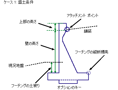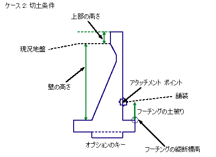 アタッチメント ポイントは、擁壁が切土条件か盛土条件かによって変わります。盛土条件の場合、アタッチメント ポイントは擁壁の上部付近にあります。切土条件の場合、アタッチメント ポイントはフーチング付近にあります。