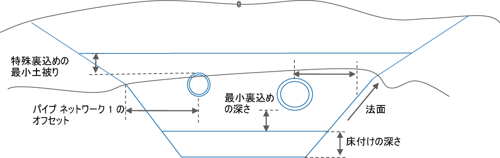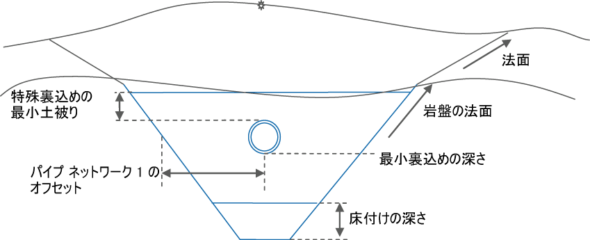 | パイプ ネットワーク 1 のオフセット | パイプの外側エッジからトレンチの法面へのオフセット | 数値、正 | 0.0 |