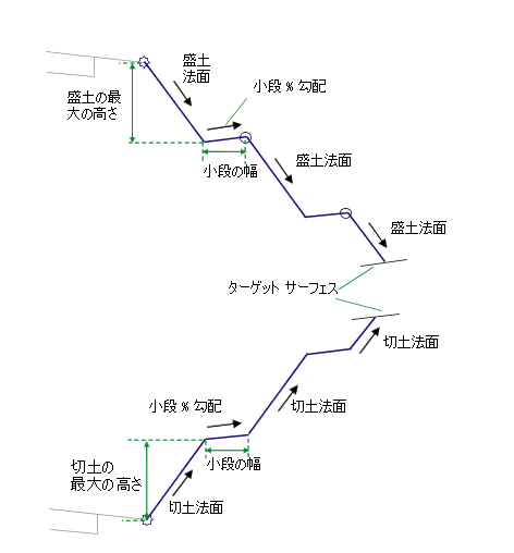 レイアウト モードの場合、高さを最大にした最初の切土および盛土法面、1 つの小段、高さを最大の半分にした切土および盛土法面展開勾配を順に描画します。法面展開リンクの最後には、外側を向いた矢印が付きます。
