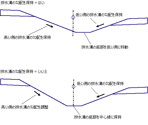 排水溝勾配の上端標高が左右で異なる場合、排水溝の法面を維持して排水溝の位置を移動するか、または排水溝の位置を常に中央に維持して上端標高が高い側の法面を調整するかを選択します。 |